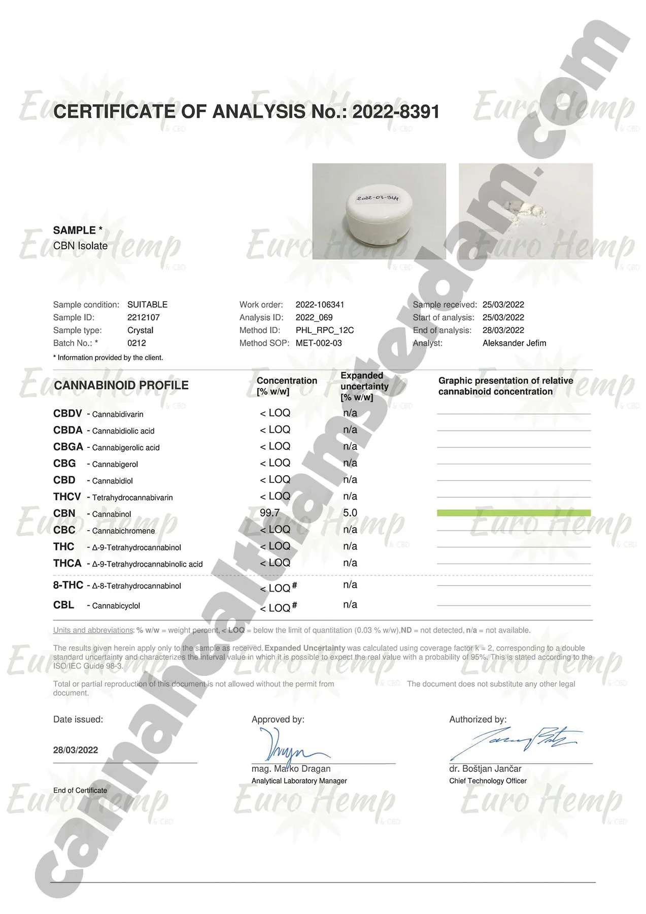 99,8 % reine CBN-Kristalle werden ausschließlich mit Ethanol extrahiert. Wir sind fest entschlossen, reines und hochwertiges CBN zu verwenden, und legen die Messlatte hoch. Hochwertiges Ethanol, das zur Extraktion verwendet wird, übertrifft selbst die strengsten EU-Pharmakopöe-Normen. Unser hochmodernes Raffinationsverfahren entfernt alle Nicht-CBN-Verbindungen. Als Ergebnis erhalten Sie die feinsten CBN-Kristalle, die je geschaffen wurden.