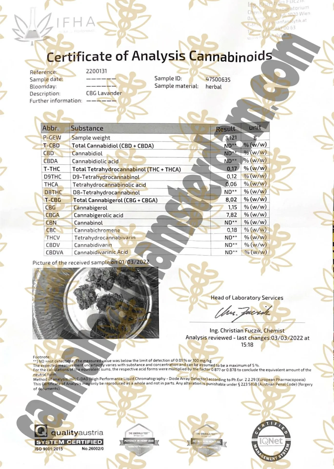 - THC-Gehalt: LOQ (< Limit of Quantification) – Nicht psychoaktiv