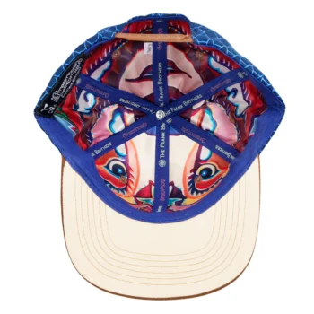 Einführung der Blue Gold Macaw Federn Snapback-Mütze von Grassroots California – eine wunderschön gestaltete Cap mit feinen Hanf-Frontpanelen und einem auffälligen gestickten Aradesign.