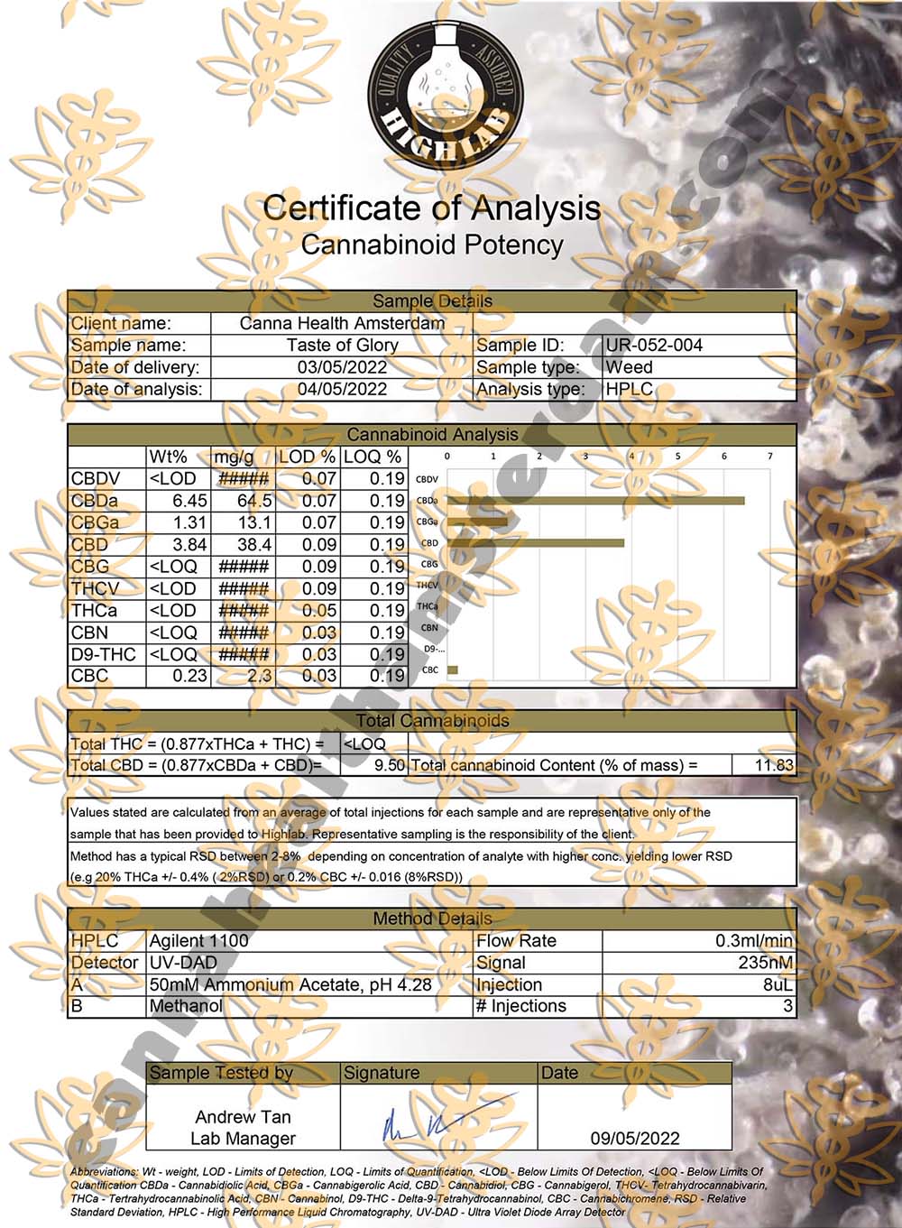 Taste of Glory wird biologisch angebaut und streng im Labor getestet. Es erfüllt die höchsten Anforderungen an Reinheit und Qualität und ist damit die perfekte Wahl für alle, die ein zuverlässiges Produkt mit hohem CBD-Gehalt ohne psychoaktive Wirkungen suchen.
