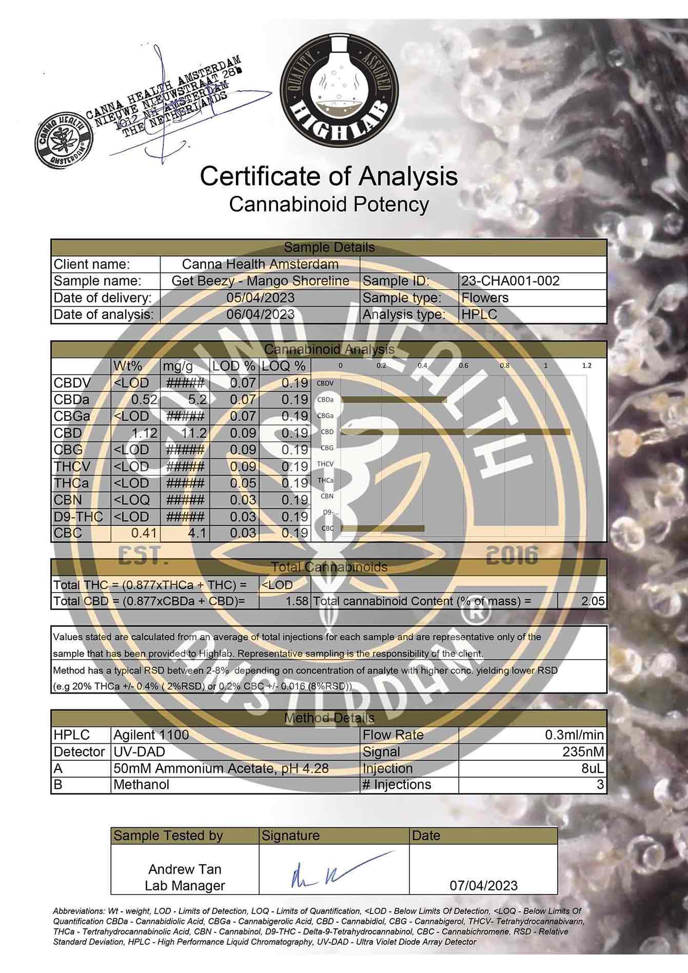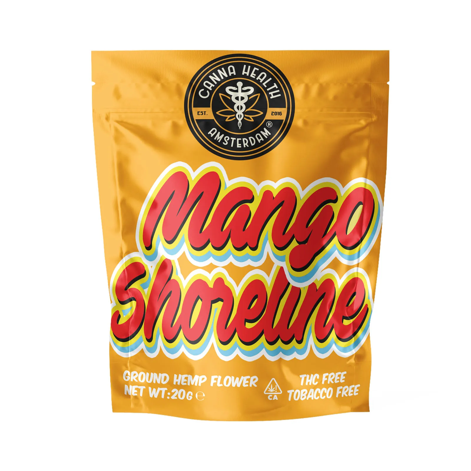 Erleben Sie das tropische Glück von THCp Get Beezy: Mango Shoreline von Canna Health Amsterdam, ein 20g Beutel mit erstklassigem, THCp-infundiertem, THC-freiem Hanfblüten.