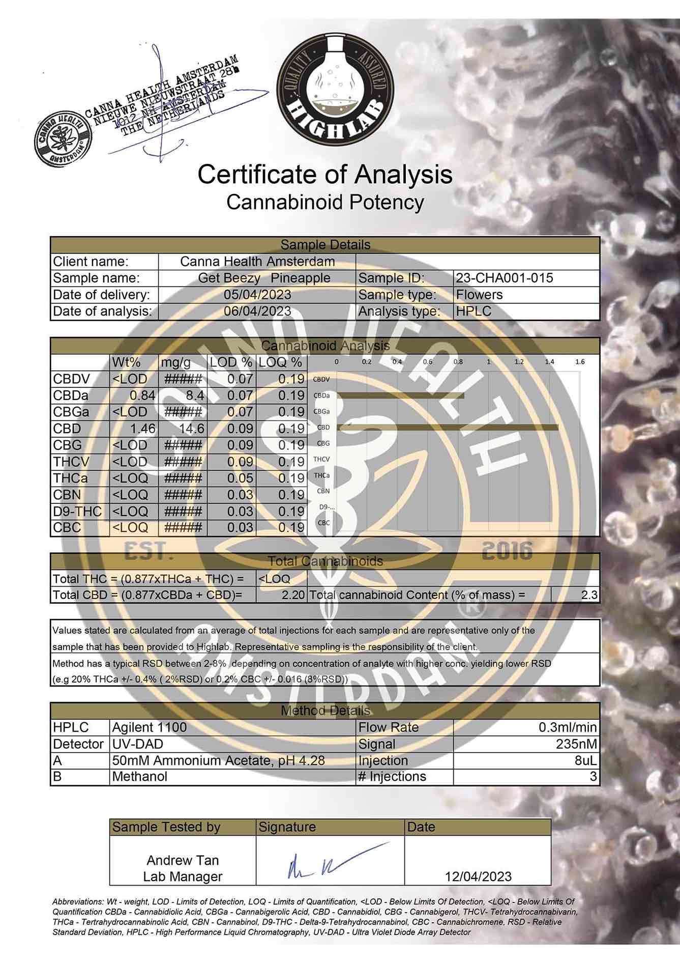 Treten Sie ein in die lebendige Welt von THCp Get Beezy: Pineapple Express, einer weiteren exquisiten Auswahl von Canna Health Amsterdam. Dieses 20g-Säckchen enthält THCp-angereicherte gemahlene Hanfblüten, frei von Tabak, und zeigt unser Engagement für unvergleichliche Reinheit.